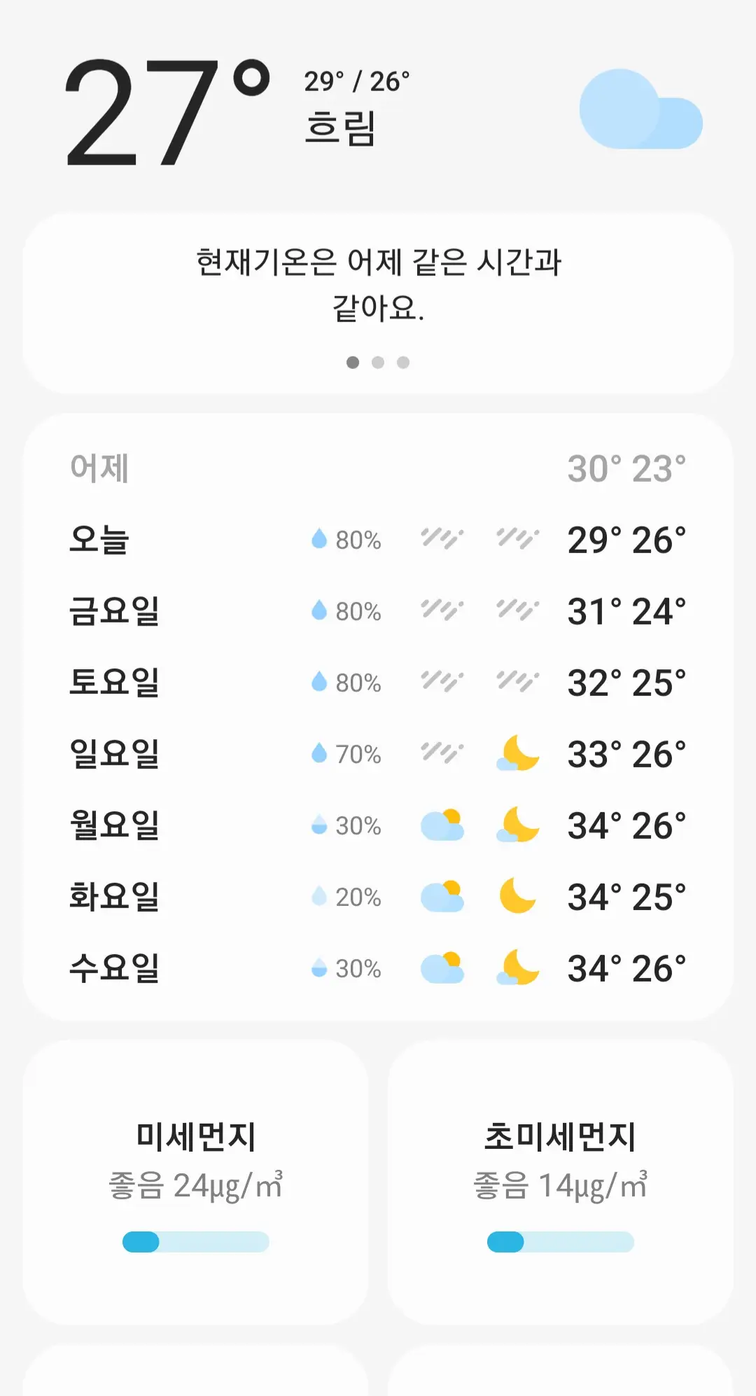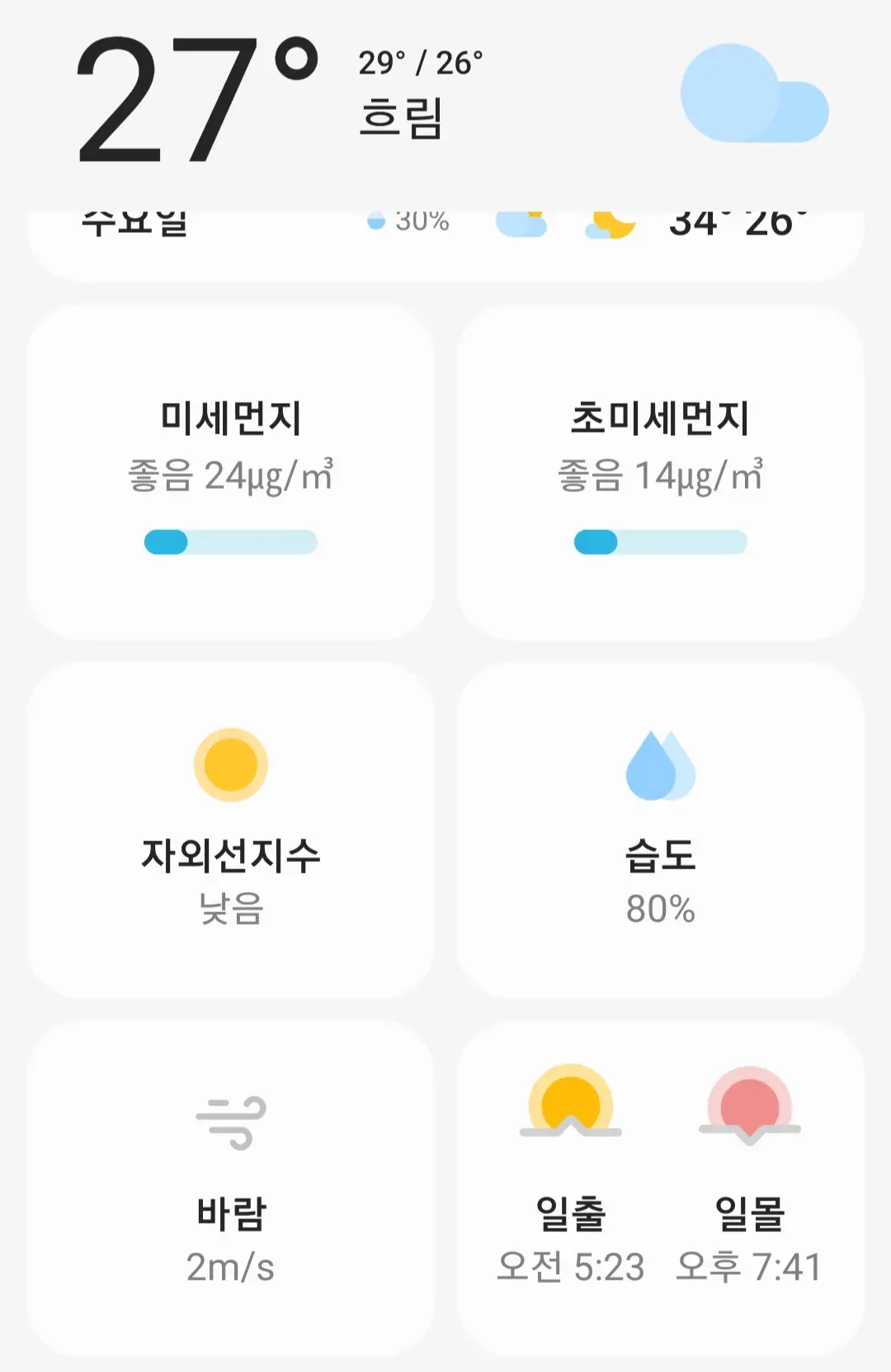 5. 다 하셨다면 위젯을 눌러 들어가시면 현재 계시는 곳의 날씨, 온도등 보는 시점부터 24시간의 날씨, 일주일 간의 날씨, 일출, 일몰 시간까지 자세히 보여줍니다.