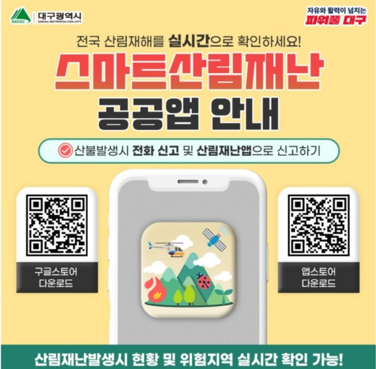 대구광역시 공식 블로그에서도 소개한 ‘스마트산림재난 앱’은 누구나 간편하게 산불을 신고하고 위험 지역 정보를 실시간으로 확인할 수 있는 공공 안전 앱입니다.
